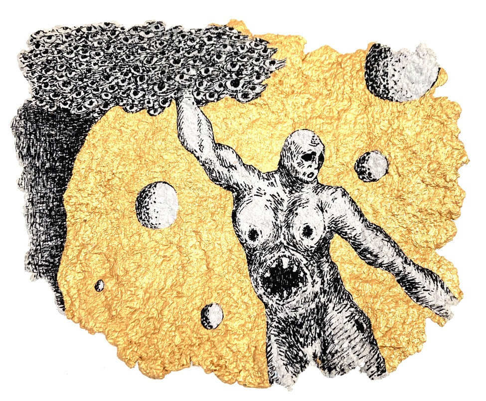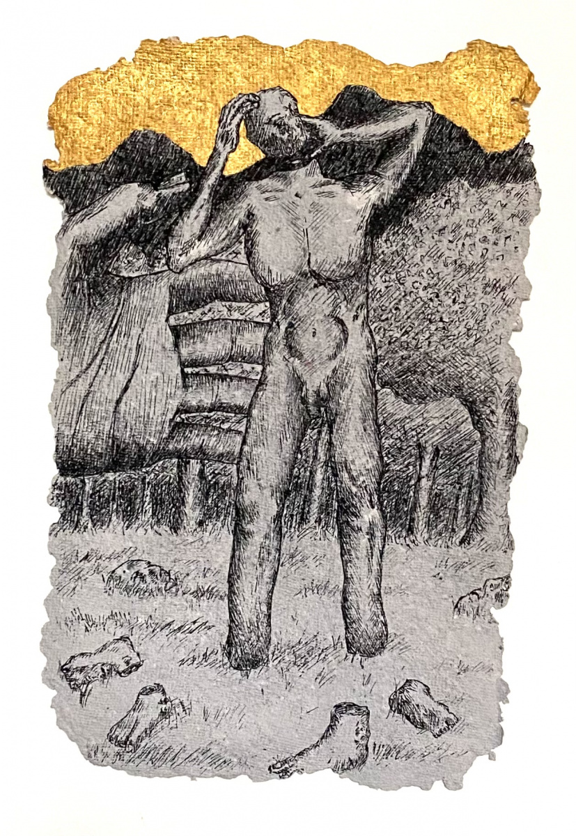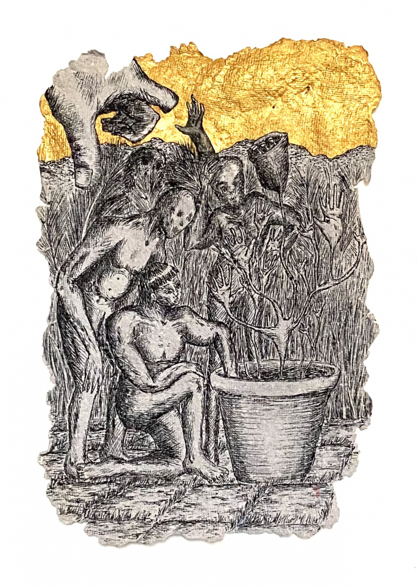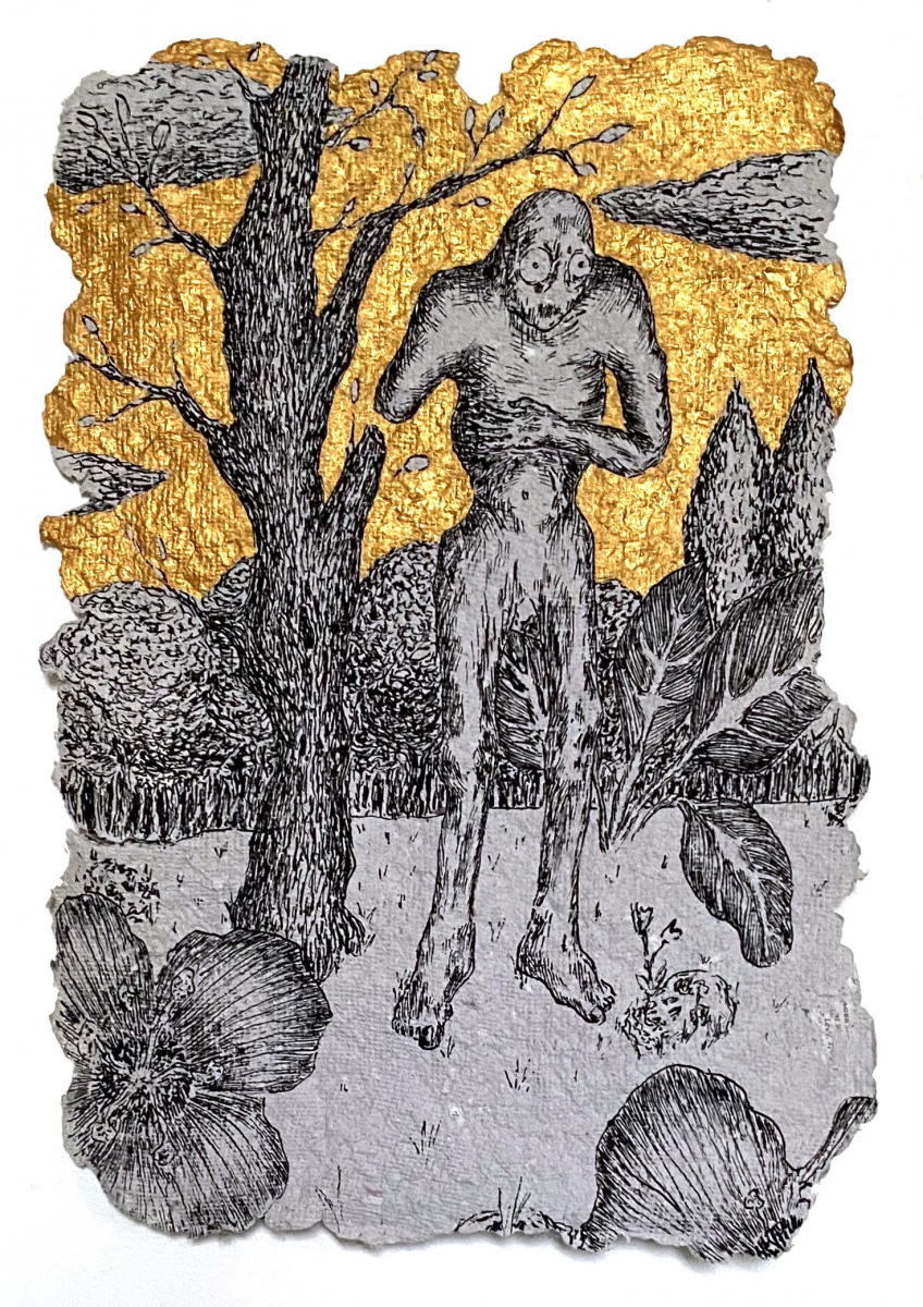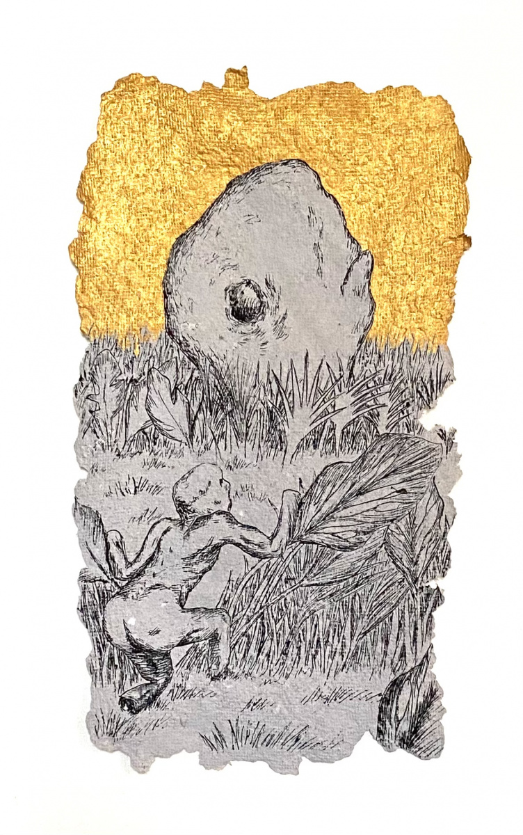 Depuis 2020 je gratte dans Le Monde et sa grisaille des paysages oniriques à l’encre de chine. Totalement spontanés, ma plume y fait ainsi émerger des scènes incongrues où des êtres amputés de leurs sens ou de leurs membres errent dans des paysages dont la luxuriance végétale n’en est pas moins comme habitée par une menace imminente. Ces images, je les apparente à des fragments de rêves cachés, raison pour laquelle je leur conserve des contours irréguliers, comme si elles avaient été arrachées d’une fresque, et que je peints en or les ciels de ces Arcadies déchues, en référence aux Lamelles de Pyrgi, aux fresques pompéiennes ou à la peinture byzantine.