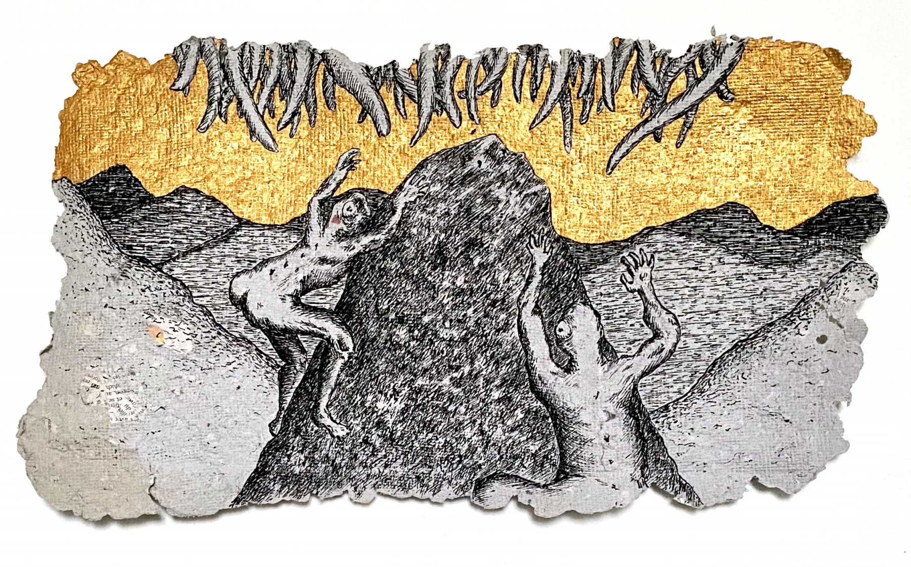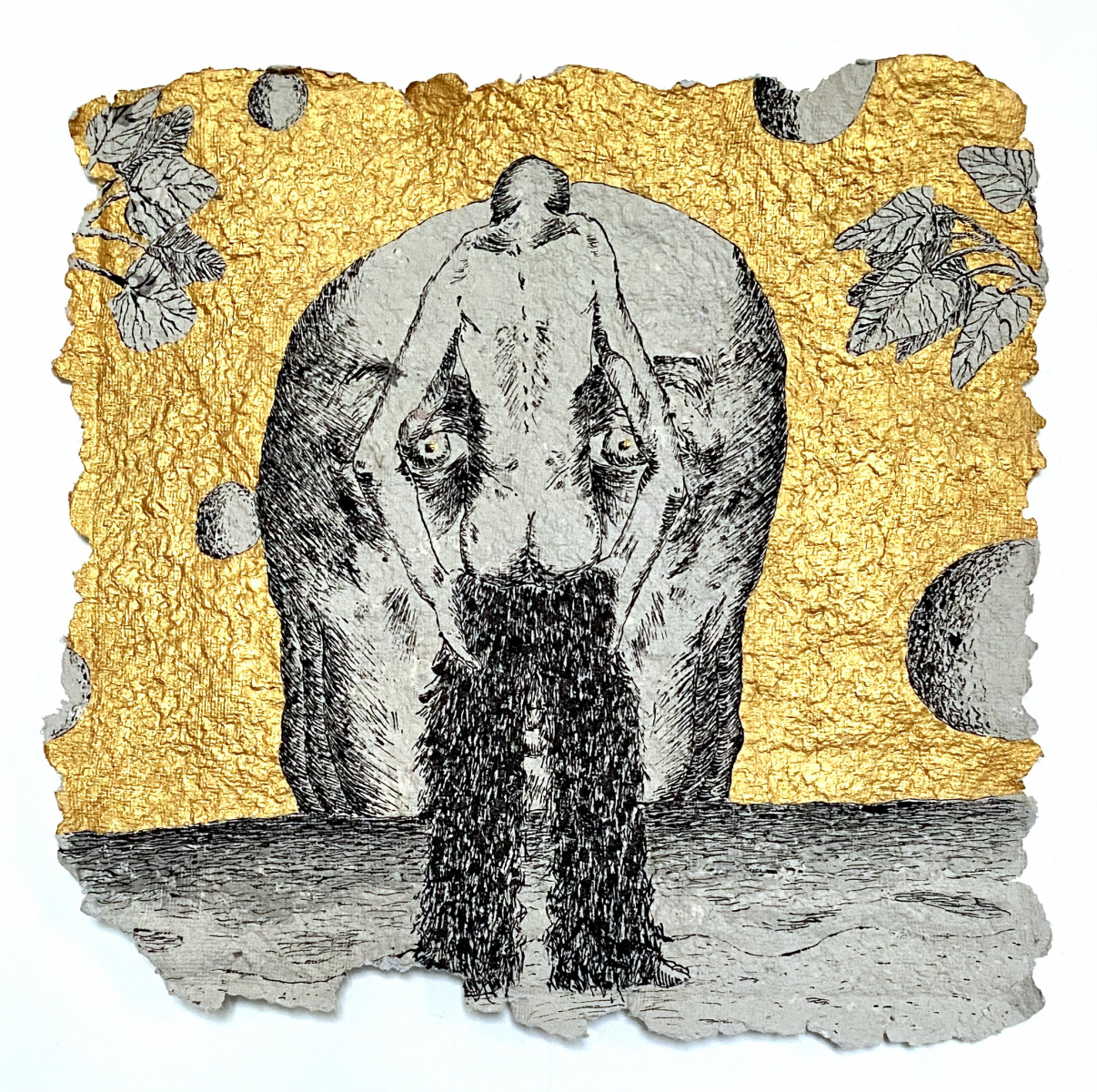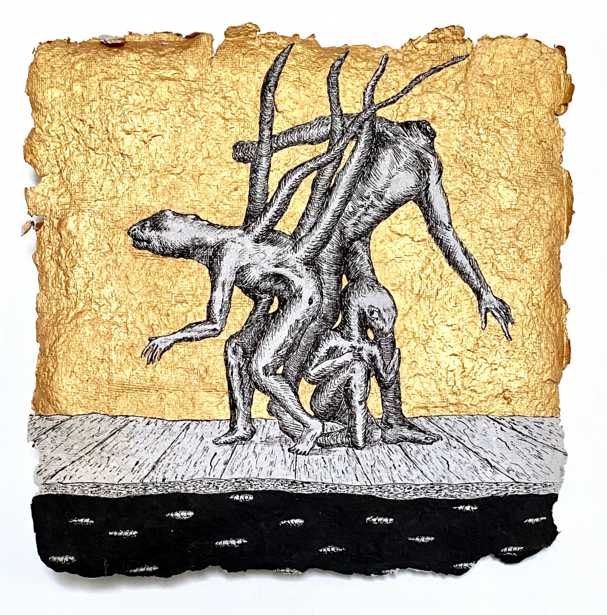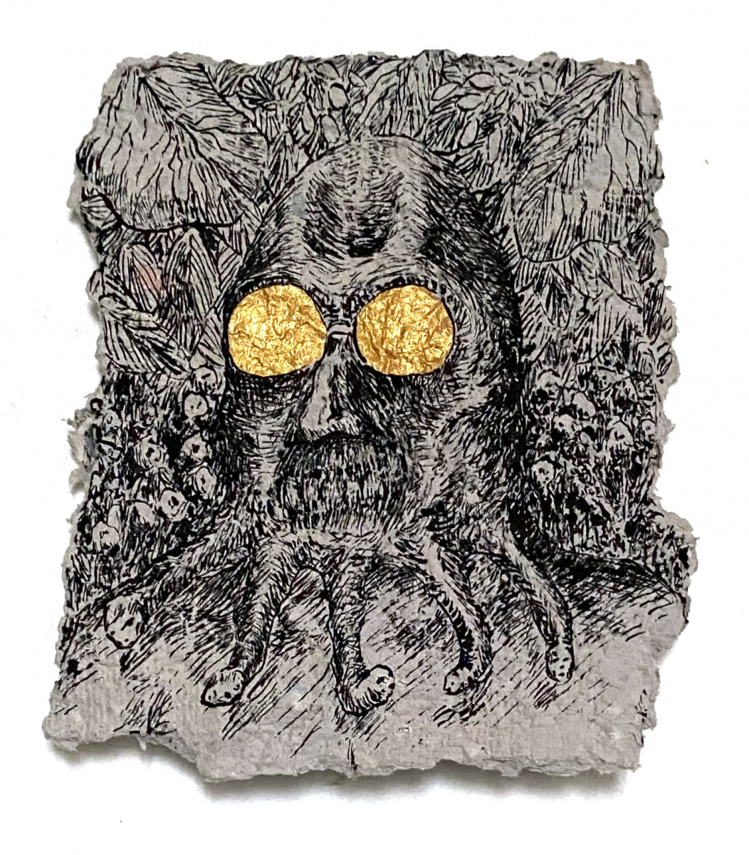 Depuis 2020 je gratte dans Le Monde et sa grisaille des paysages oniriques à l’encre de chine. Totalement spontanés, ma plume y fait ainsi émerger des scènes incongrues où des êtres amputés de leurs sens ou de leurs membres errent dans des paysages dont la luxuriance végétale n’en est pas moins comme habitée par une menace imminente. Ces images, je les apparente à des fragments de rêves cachés, raison pour laquelle je leur conserve des contours irréguliers, comme si elles avaient été arrachées d’une fresque, et que je peints en or les ciels de ces Arcadies déchues, en référence aux Lamelles de Pyrgi, aux fresques pompéiennes ou à la peinture byzantine.