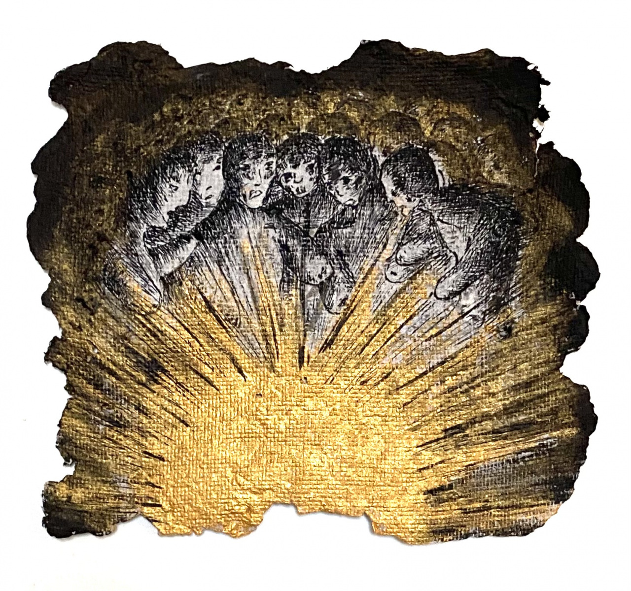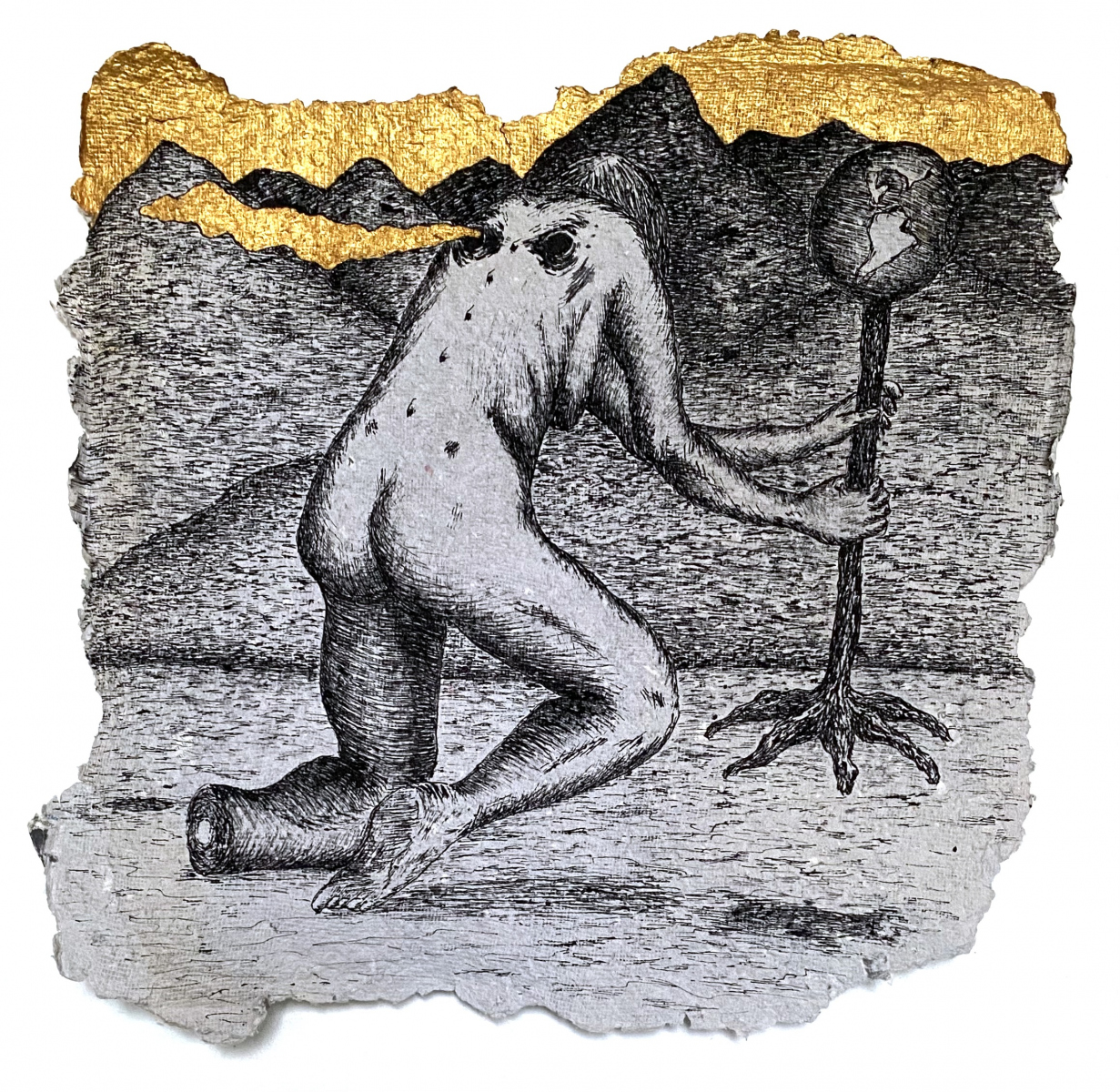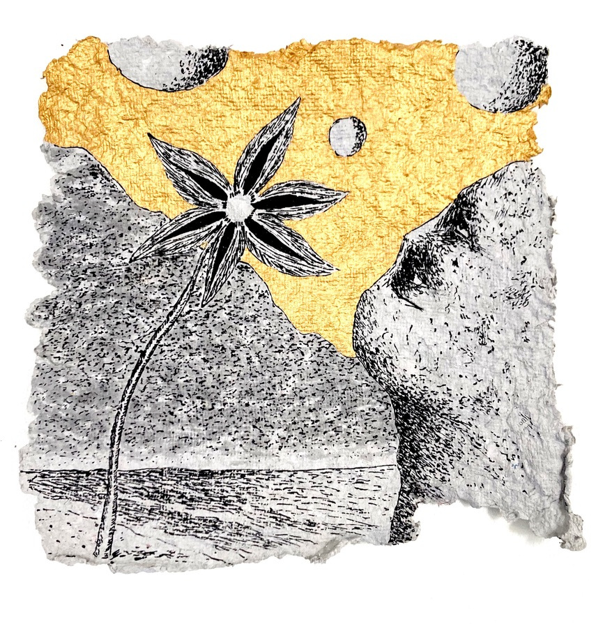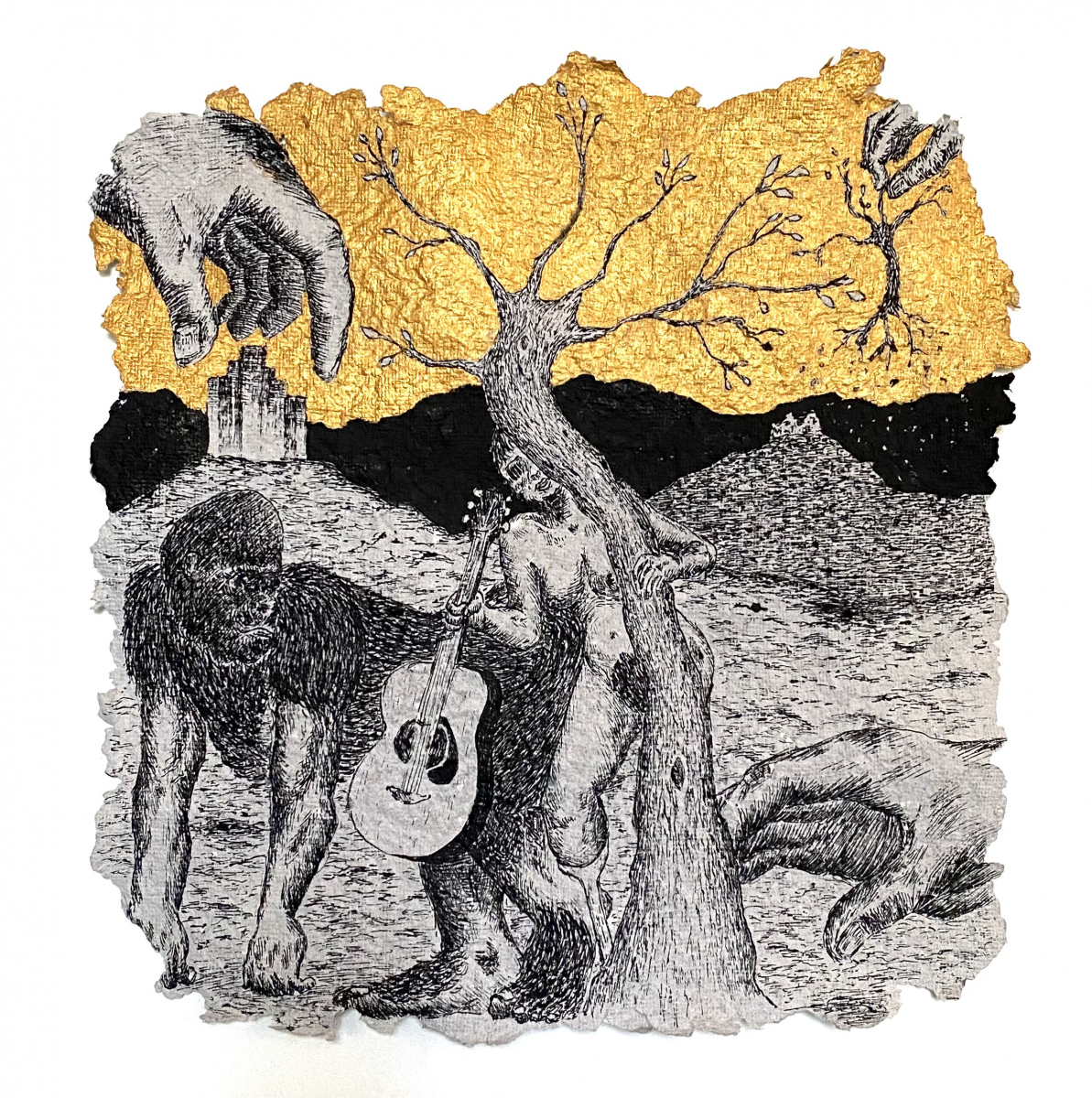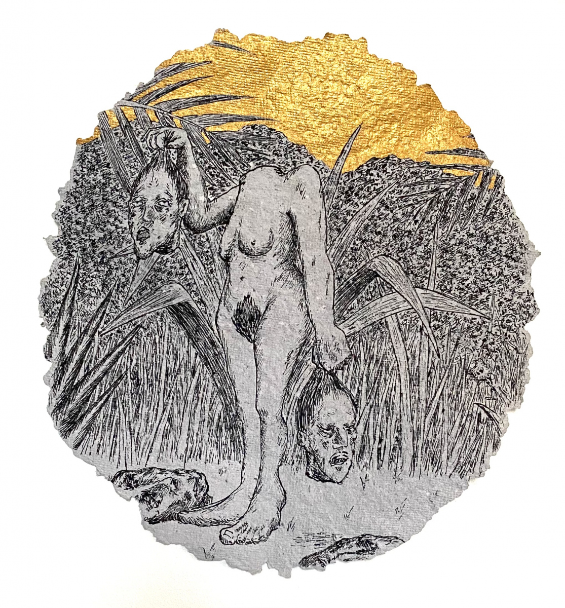 Depuis 2020 je gratte dans Le Monde et sa grisaille des paysages oniriques à l’encre de chine. Totalement spontanés, ma plume y fait ainsi émerger des scènes incongrues où des êtres amputés de leurs sens ou de leurs membres errent dans des paysages dont la luxuriance végétale n’en est pas moins comme habitée par une menace imminente. Ces images, je les apparente à des fragments de rêves cachés, raison pour laquelle je leur conserve des contours irréguliers, comme si elles avaient été arrachées d’une fresque, et que je peints en or les ciels de ces Arcadies déchues, en référence aux Lamelles de Pyrgi, aux fresques pompéiennes ou à la peinture byzantine.