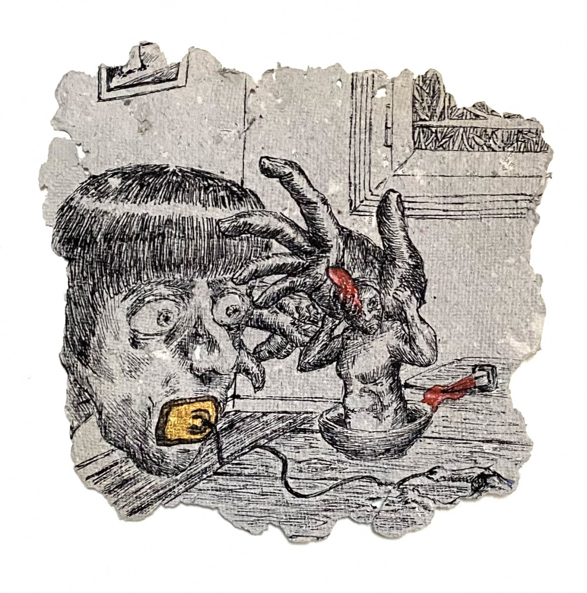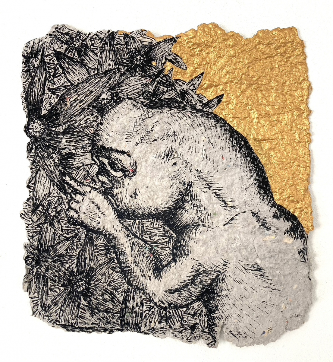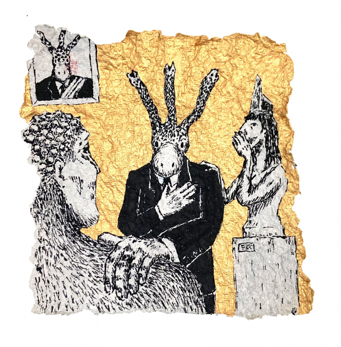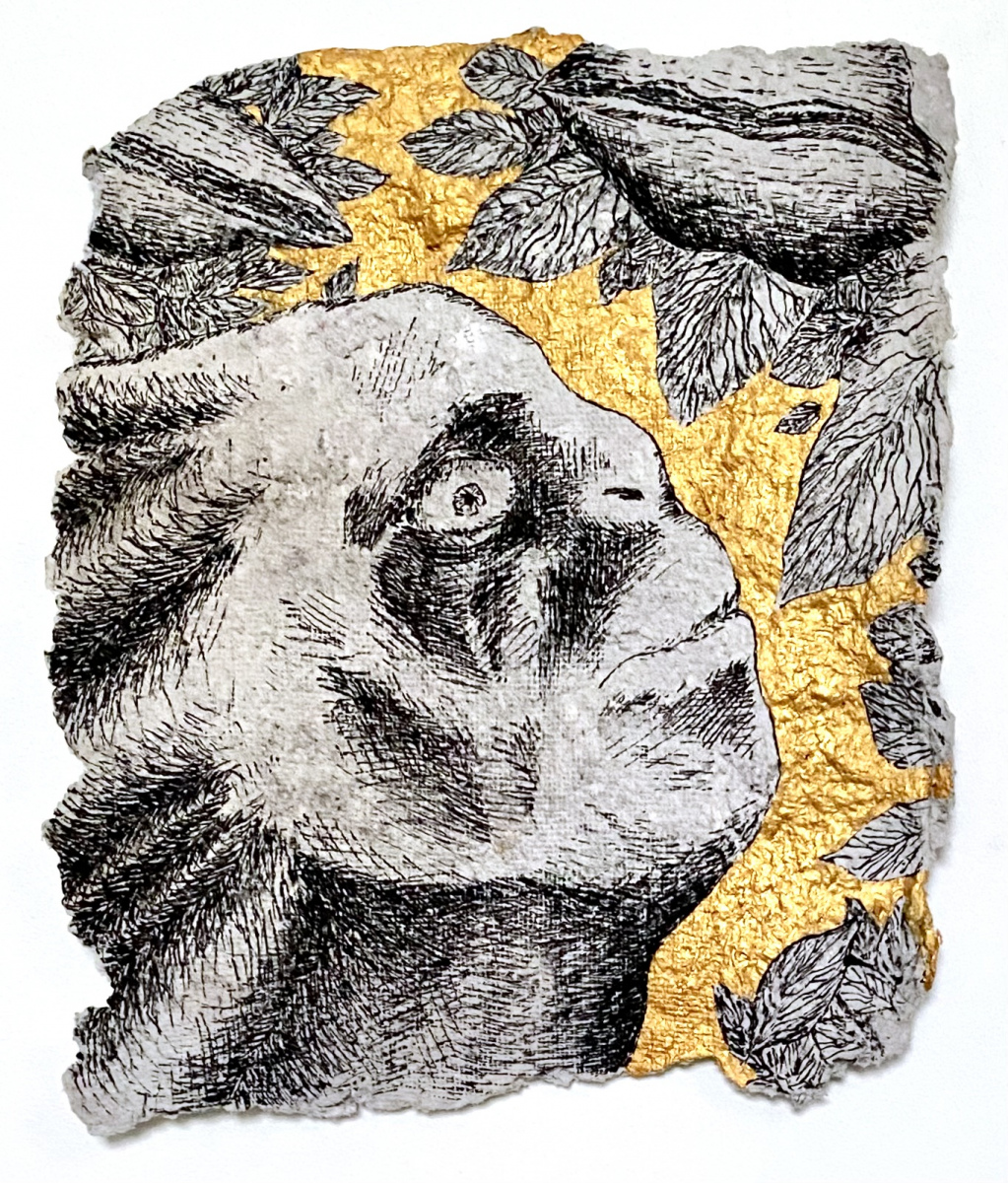 Depuis 2020 je gratte dans Le Monde et sa grisaille des paysages oniriques à l’encre de chine. Totalement spontanés, ma plume y fait ainsi émerger des scènes incongrues où des êtres amputés de leurs sens ou de leurs membres errent dans des paysages dont la luxuriance végétale n’en est pas moins comme habitée par une menace imminente. Ces images, je les apparente à des fragments de rêves cachés, raison pour laquelle je leur conserve des contours irréguliers, comme si elles avaient été arrachées d’une fresque, et que je peints en or les ciels de ces Arcadies déchues, en référence aux Lamelles de Pyrgi, aux fresques pompéiennes ou à la peinture byzantine.